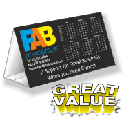 2 Sided Table Tent Card Ideal for menus, wine lists, price lists etc. Used widely in the Health & Beauty, Banking, Hotel, Catering and Tourist sectors. Different artwork can be used on 2 sides, increasing promotional potential. Price includes full colour (4 colour process) print to 2 sides. Printed on heavy 260gsm silk artboard from your supplied artwork. Supplied flat, bulk packed & pre-creased, ready for easy assembly (no sticking required).