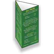 3 Sided Table Tent Card Ideal for menus, wine lists, price lists etc. Used widely in the Health & Beauty, Banking, Hotel, Catering and Tourist sectors. Different artwork can be used on all 3 sides, increasing promotional potential. Price includes full colour (4 colour process) print to 3 sides. Printed on heavy 260gsm silk artboard from your supplied artwork. Supplied flat, bulk packed & pre-creased, ready for easy assembly (no sticking required).